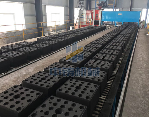 1、全自動(dòng)造型機(jī)打出來砂型直接在鏈板線上循環(huán)輸送,可以是單排雙列,也可以雙排雙列;